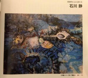作者の豊かな色彩感覚が横溢する、明度の高い鮮やかな青の濃淡が印象的な一作。以前石川氏の「バイオーラ」という真っ赤な衣装が印象的な、情熱溢れるフラメンコダンサーの作品をご紹介したが、今回は対照的な色とモチーフで新鮮である。海の恵みを感じさせる貝殻が寄り集まり、囁き合っているようだ。海面から透けて見える岩は繊細な線描で表現される一方、海水は左右に筆を大きくストロークさせながら描き、貝殻は引っ搔いたような筆触と細やかにかつダイナミックに描き分けられている。さて、タイトルの「潮騒」といえば同題の三島由紀夫の傑作が思い浮かぶ。古代ギリシャの散文作品「ダフニスとクロエ」に着想を得て書かれた牧歌的な恋物語であり、本作のようにどこまでも青く美しい海辺を舞台にしている。文学のイメージともあいまって重層的に心に訴えてくる優品である。